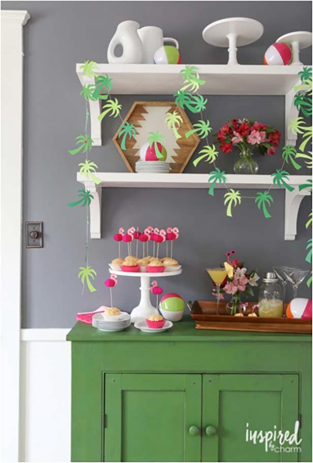To get started with decor, I felt a homemade garland was in order. I wanted to keep things simple and easy so I decided to make a palm tree garland out of green card stock and pink string. It was a breeze to make and it turned out so perfect for the party.