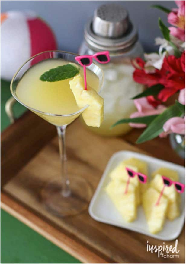 However, to make this cocktail fit in a bit better with the party, I decided to add a bit of interest and color to the garnish. I sliced up some fresh pineapple, added a slice to the side of the glass, and poked in a fun sunglasses pick.
