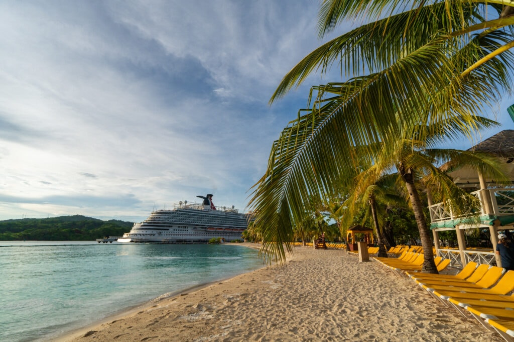 Image: A Carnival ship sits near a beach in the Caribbean, surrounded by turquoise waters and golden sand