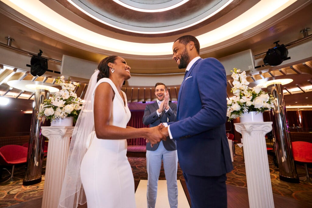 Image: A couple exchanges vows at a renewal ceremony onboard a Carnival Cruise Line ship