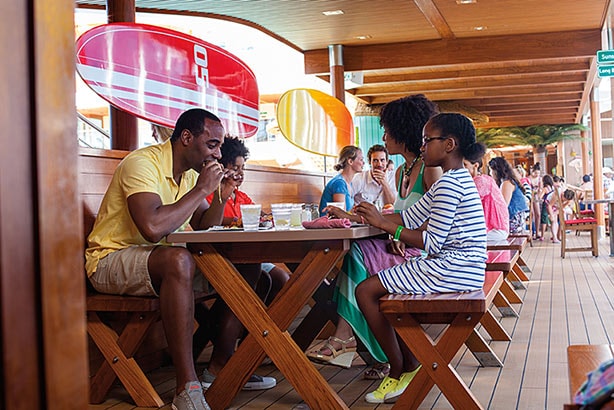 At this hamburger joint by restaurateur and TV personality Guy Fieri, choose a burger from the menu or create your own, making it as plain or as fancy as you like. Guy’s Burger Joint is located poolside, so lunch will not distract you from swimming for too long. The ambiance could not be more casual — shoes and a shirt are NOT required!