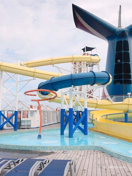 We spent quite a bit of time by the pool on our cruise. Ecstasy had two different pool areas, and we especially enjoyed the pool that was geared toward kids. It had side-by-side racing slides and a big twister waterslide. The girls convinced their grandmother to go down the twister slide and she loved it!