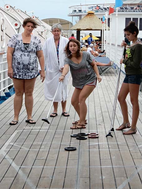 By the larger pool we found a ping pong table and a shuffleboard court. Grandma Debbie was excited to instruct the girls in their first game of shuffleboard. I would have never guessed that we would have so much fun playing shuffleboard.