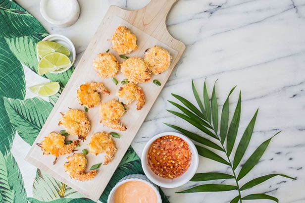 Overhead photo of coconut shrimp and ingredients on a kitchen counter
