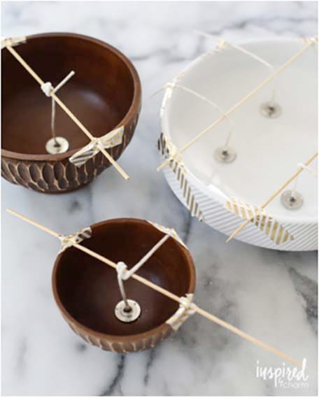 To keep the wick upright when pouring in the wax, secure it with a bamboo stick and tape.