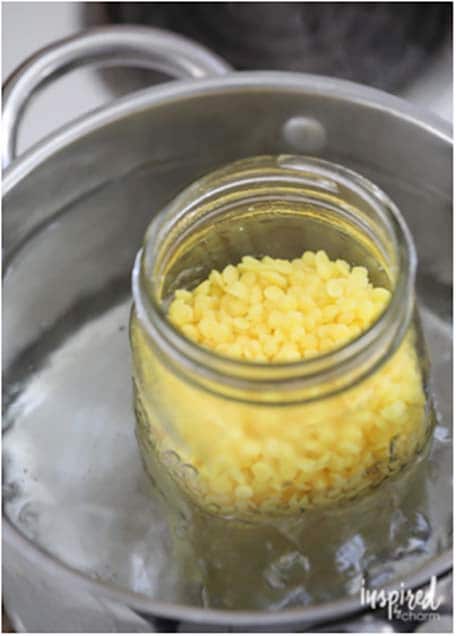 Next, you’re ready to melt the wax. Begin by filling a large heatproof glass mason jar with the beeswax pellets. Then, fill a large saucepan with enough water so that the water level is slightly above the height of the beeswax. Place the jar into the water and heat the water until it reaches a gentle boil.