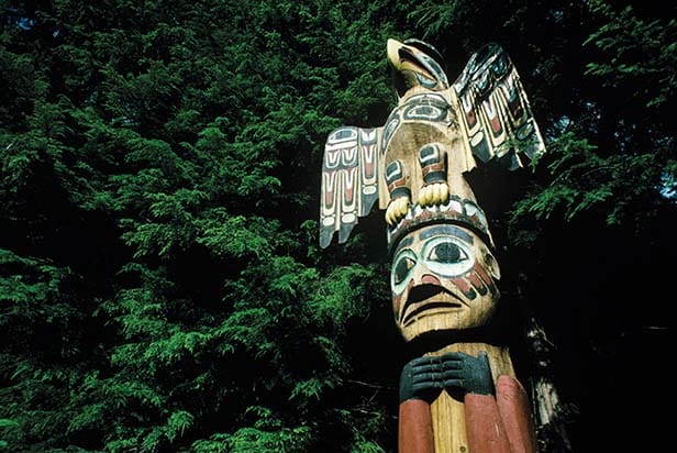 A traditional art form among Natives of Southeast Alaska, totem poles reflect ancestral pride by depicting the lives and history of the people who create them. They are carved out of huge cedar trees and often display carvings of animals found in the region, such as eagles, ravens, frogs, bears, wolves and whales. After they are erected, totem poles stand as long as nature permits, typically 50 or 60 years. When the pole eventually falls to the ground, it is left to decay or is used for firewood.