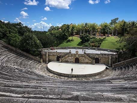 After lunch, we went for a walk to explore more of Altos de Chavón. There’s a bit of music history here, as the Romanesque-style amphitheater opened with a music festival, Concert For The Americas. It’s still a big music venue today as we saw posters advertising a popular concert coming up later in the month. And while no musical acts were performing during our afternoon visit, we certainly had fun climbing tiered limestone seats and testing out the acoustics.