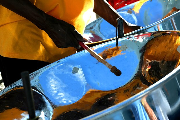 man playing reggae music on steel drums