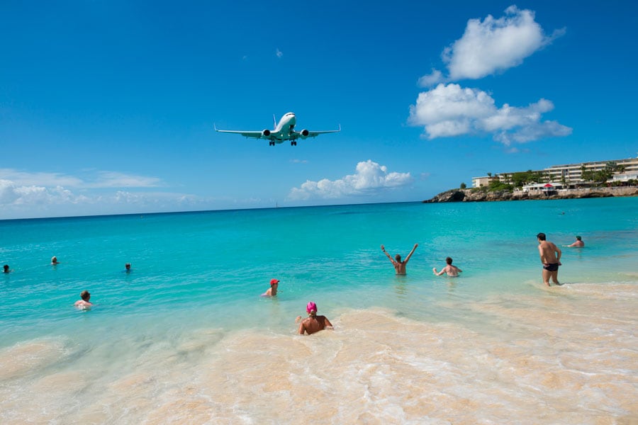 beach goers in Maho Beach stand by and watch a commercial airplane fly over them as the plane  prepares to land