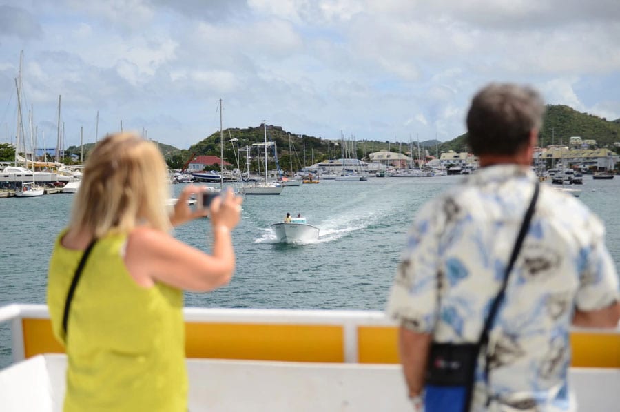 couple takes a photo of st maarten coastline during a boat tour as another boat passes by
