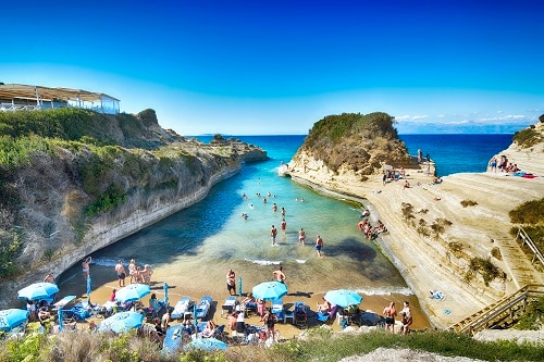 If you’re in love or love the cloud nine feeling, visit Canal d’Amour (Love Canal), one of Corfu’s most beautiful natural attractions. Located on the northwestern tip of the island near the village of Sidari, the aquamarine canal is flanked by scenic, sandstone rock formations on both sides and features a small, sandy beach at one end.