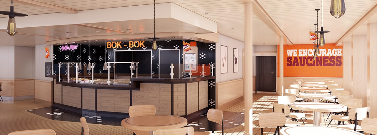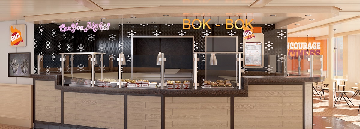 We heard our CFO wanted us to build a new chicken restaurant… and we were all a little confused. Then we found out they meant Shaq, our Chief Fun Officer. (Happens all the time!) Anyway, when Shaq tells you to build a chicken joint on board, you start warming up immediately. The big guy brings his poultry know-how and good taste to the seas with Big Chicken!